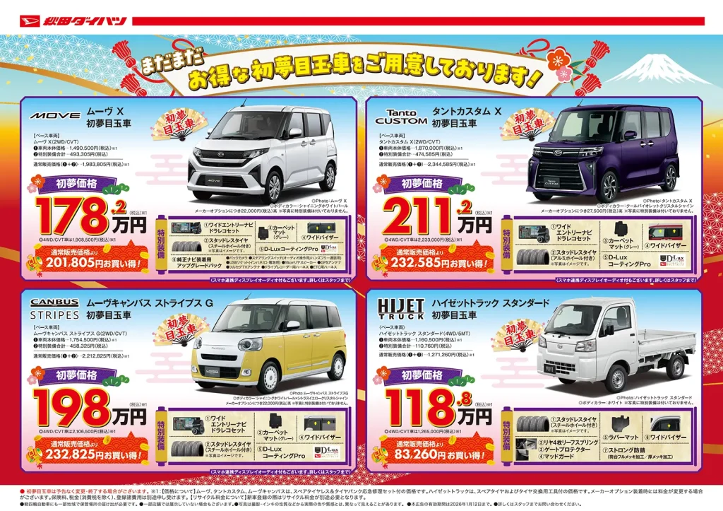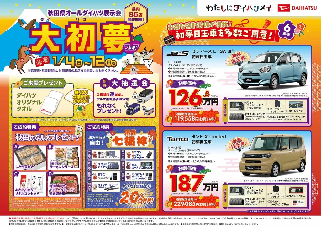 初売りならではの特別装備が満載でお得な「初夢目玉車」、ご来場プレゼントや新春大抽選会、選べてうれしいご成約特典もご用意しております。